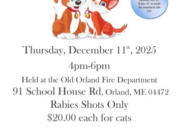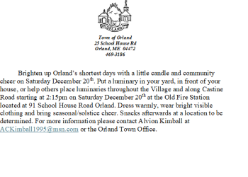 Orland Luminary Ceremony: Brighten up Orland’s shortest days with a little candle and community cheer on Saturday December 20th. Put a luminary in your yard, in front of your house, or help others place luminaries throughout the Village and along Castine Road starting at 2:15pm on Saturday December 20th at the Old Fire Station located at 91 School House Road Orland. Dress warmly, wear bright visible clothing and bring seasonal/solstice cheer. Snacks afterwards at a location to be determined. For more information please contact Alvion Kimball at [email protected] or the Orland Town Office.