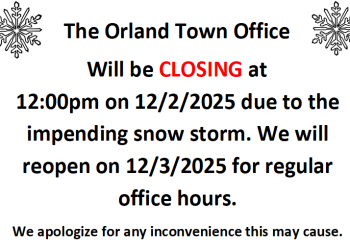 The Orland Town Office Will be CLOSING at 12:00pm on 12/2/2025 due to the impending snow storm. We will reopen… Read More