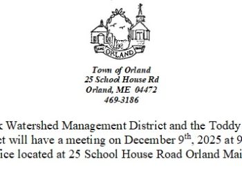 Toddy Pond Watershed Managment District Meeting 12/15: The Toddy Pond Watershed Management District will be having a meeting on December 15th,2025 at 11:00am at the Orland Fire Station located at 5 Fire House Avenue Orland Maine 04472.