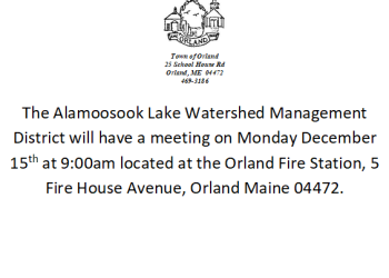 The Alamoosook Lake Watershed Management District will have a meeting on Monday December 15th at 9:00am located at the Orland… Read More