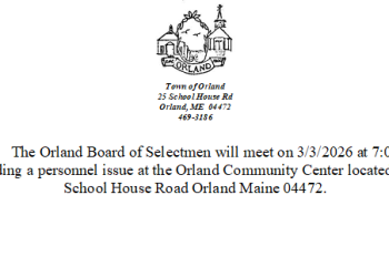 The Orland Board of Selectmen will meet on 3/3/2026 at 7:00pm regarding a personnel issue at the Orland Community Center… Read More