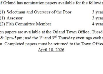 Nomination Papers: The Town of Orland has nomination papers available for the following positions: Selectman and Overseer of the Poor 3 years Assessor 3 years (2) Fish Committee Member 4 years Nomination papers are available at the Orland Town Office, Tuesday-Friday, 8am-12pm & 1pm-5pm; and the 1st and 3rd Thursday evenings each month from 5:30pm-7pm. Completed papers must be returned to the Town Office by 5pm on April 10, 2026.