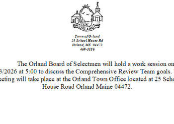 The Orland Board of Selectmen will hold a work session on 4/23/2026 at 5:00 to discuss the Comprehensive Review Team… Read More