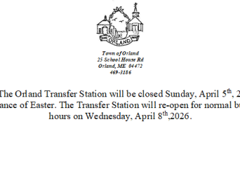 The Orland Transfer Station will be closed Sunday, April 5th, 2026, in observance of Easter. The Transfer Station will re-open… Read More