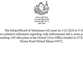 The Orland Board of Selectmen will meet on 3/23/2026 at 5:30 to discuss potential ordinances regarding code enforcement and a… Read More