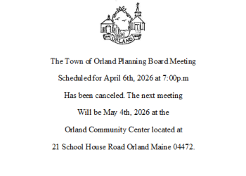 Planning Board Meeting Canceled: The Town of Orland Planning Board Meeting Scheduled for April 6th, 2026 at 7:00p.m Has been canceled. The next meeting Will be May 4th, 2026 at the Orland Community Center located at 21 School House Road Orland Maine 04472.