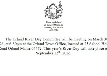 The Orland River Day Committee will be meeting on March 30th, 2026, at 6:30pm at the Orland Town Office, located… Read More