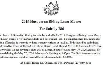 2019 Husqvarna Riding Lawn Mower For Sale by Bid The Town of Orland is offering for sale by sealed bid… Read More