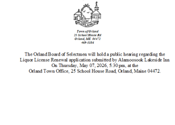 liquor license hearing 05/07/2026: The Orland Board of Selectmen will hold a public hearing regarding the Liquor License Renewal application submitted by Alamoosook Lakeside Inn On Thursday, May 07, 2026, 5:30 pm, at the Orland Town Office, 25 School House Road, Orland, Maine 04472.
