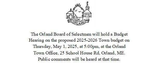 The Budget Hearing for the proposed 2025-2026 Town Budget has been rescheduled from May 1st, 2025, at 5:00pm to May 8th, 2025 at 5:00pm at the Orland Town Office 25 School House Rd, Orland, ME. Public comments will be heard at that time.