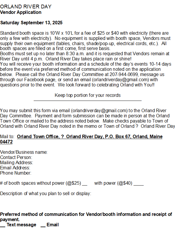 There’s still time to sign up to be a vendor for Orland River Day happening September 13th 2025 from 9-4 along Narramissic Drive and events happening at the Orland Community and Fitness Center from 10-4. Any questions please reach out to the committee at [email protected].