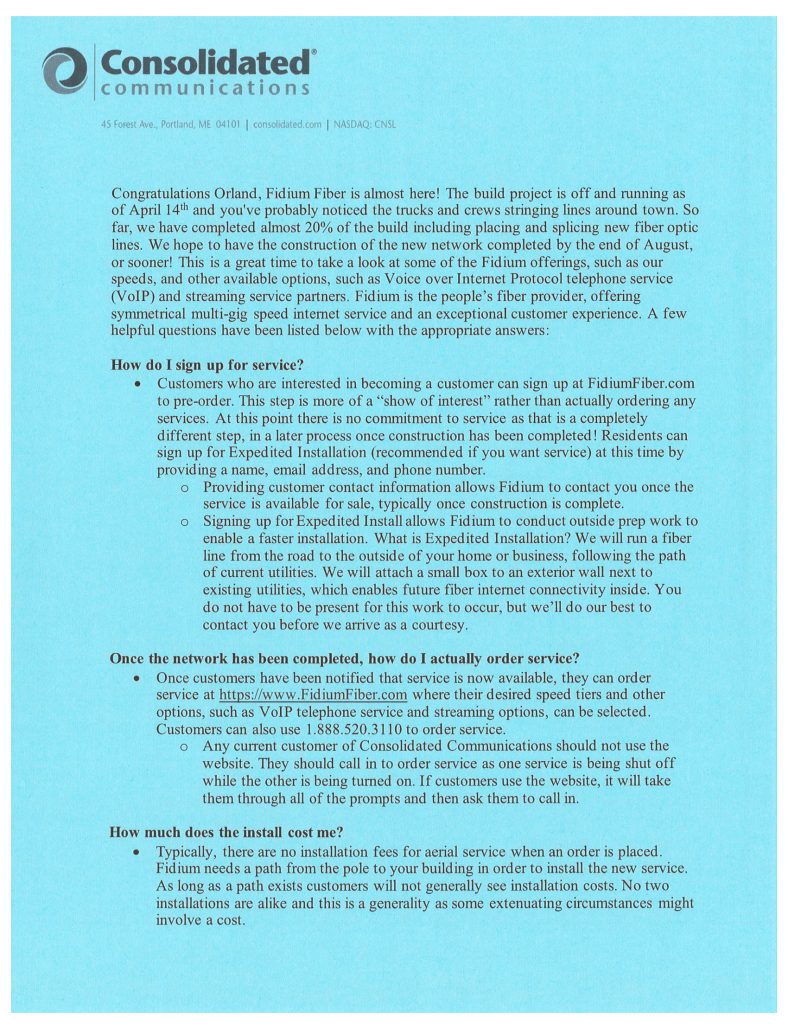 Congratulations Orland, Fidium Fiber is almost here! The build project is off and running as of April 14th and you’ve probably noticed the trucks and crews stringing lines around town. So far, we have completed almost 20% of the build including placing and splicing new fiber optic lines. We hope to have the construction of the new network completed by the end of August, or sooner! This is a great time to take a look at some of the Fidium offerings, such as our speeds, and other available options, such as Voice over Internet Protocol telephone service (VoIP) and streaming service partners. Fidium is the people’s fiber provider, offering symmetrical multi-gig speed internet service and an exceptional customer experience. A few helpful questions have been listed below with the appropriate answers: