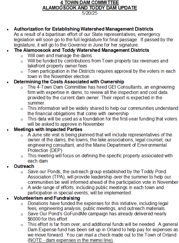 - This effort is far from over, and additional funds will be needed. A general Dam Expense fund has been set up in Orland to help pay for expenses as we move forward. You can mail a check made out to the Town of Orland (NOTE – dam expenses in the memo line).