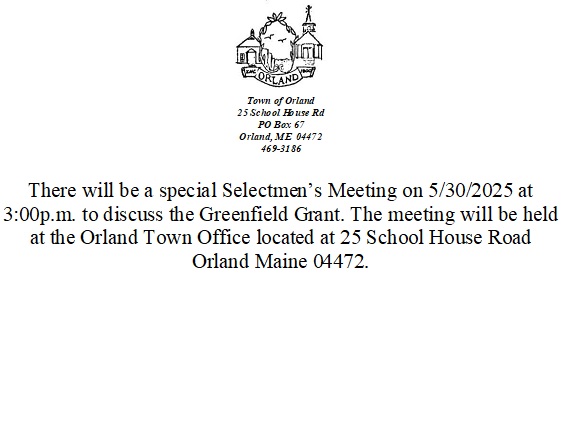 There will be a special Selectmen’s Meeting on 5/30/2025 at 3:00p.m. to discuss the Greenfield Grant. The meeting will be held at the Orland Town Office located at 25 School House Road Orland Maine 04472.