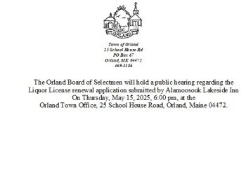 The Orland Board of Selectmen will hold a public hearing regarding the Liquor License renewal application submitted by Alamoosook Lakeside… Read More