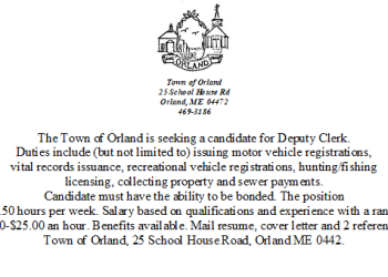The Town of Orland is seeking a candidate for Deputy Clerk. Duties include (but not limited to) issuing motor vehicle… Read More
