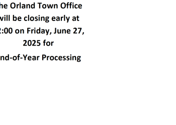 The Orland Town Office will be closing early at 12:00 on Friday, June 27, 2025 for End-of-Year Processing