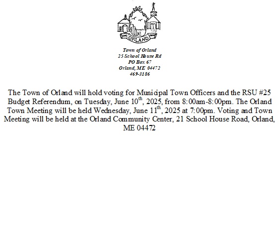The Town of Orland will hold voting for Municipal Town Officers and the RSU #25 Budget Referendum, on Tuesday, June 10th, 2025, from 8:00am-8:00pm. The Orland Town Meeting will be held Wednesday, June 11th, 2025 at 7:00pm. Voting and Town Meeting will be held at the Orland Community Center, 21 School House Road, Orland, ME 04472