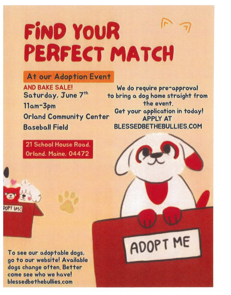 Looking for a your perfect match? Come to the Orland Community Center located at 21 School House Road Orland Maine 04472 for a dog adoption event and bake sale. Pre-approval is required to bring home a dog straight from the event. Apply at blessedbethebullies.com the event will be held June 7th 11:00-3:00 at the baseball field.
