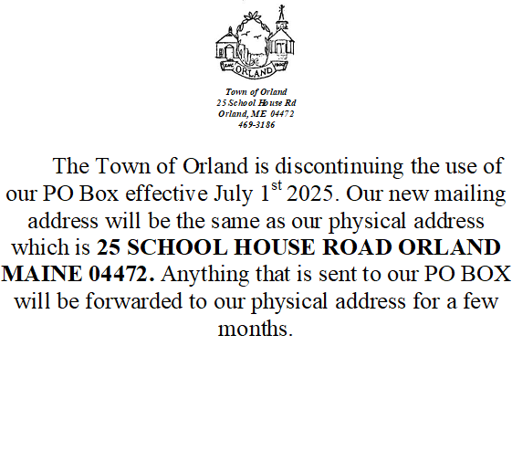 The Town of Orland is discontinuing the use of our PO Box effective July 1st 2025. Our new mailing address will be the same as our physical address which is 25 SCHOOL HOUSE ROAD ORLAND MAINE 04472. Anything that is sent to our PO BOX will be forwarded to our physical address for a few months.