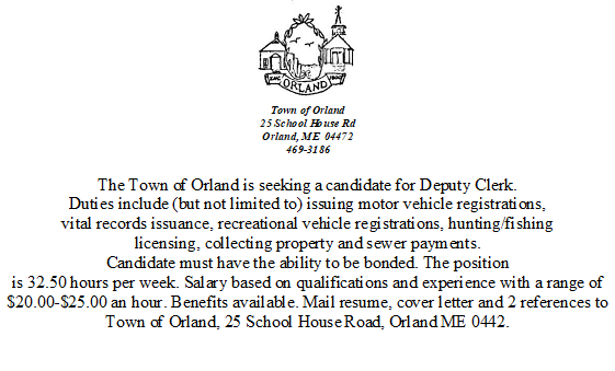 The Town of Orland is seeking a candidate for Deputy Clerk.