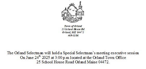 On June 24th 2025 at 3:00 p.m located at the Orland Town Office