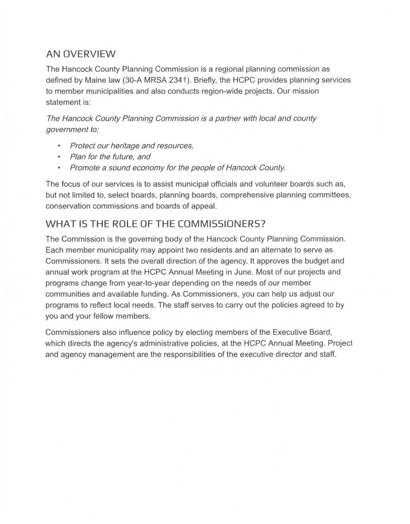 The Board of Selectmen is searching for a volunteer to serve as an Orland representative to the Hancock County Planning Commission (HCPC). HCPC guides and supports land use, planning, and development within Hancock County, Maine. They work with local towns and municipalities to ensure that development is sustainable, adheres to local and state regulations, and meets the needs of the community. Attached is a description of the responsibilities of serving as a Commissioner.