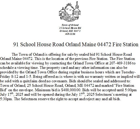 The Town of Orland is offering for sale by sealed bid 91 School House Road Orland Maine 04472. This is the location of the previous Fire Station. The Fire Station can be available for viewing by contacting the Orland Town Office at 207-469-3186 to schedule a viewing time. The property card and any other information can also be provided by the Orland Town Office during regular business hours which are Tuesday-Friday 8-12 and 1-5. Being offered as is where is with no warranty written or implied will be sold with a quitclaim deed no covenants. Bids should be sealed and addressed to: Town of Orland, 25 School House Road, Orland, ME 04472 and marked “Fire Station Bid” on the envelope. Minimum bid is $400,000.00. Bids will be accepted until 5:00pm July 17th, 2025 and will be opened during the July 17th, 2025 Selectmen’s meeting at 5:30pm. The Selectmen reserve the right to accept and reject any and all bids.
