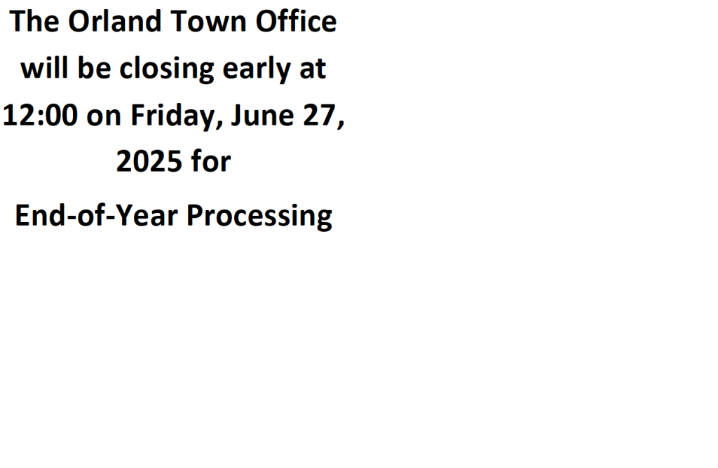 The Orland Town Office will be closing early at 12:00 on Friday, June 27, 2025 for End-of-Year Processing