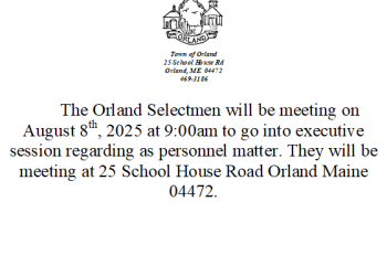 The Orland Selectmen will be meeting on August 8th, 2025 at 9:00am to go into executive session regarding as personnel… Read More