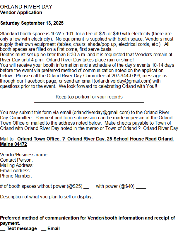 There’s still time to sign up to be a vendor for Orland River Day happening September 13th 2025 from 9-4 along Narramissic Drive and events happening at the Orland Community and Fitness Center from 10-4. Any questions please reach out to the committee at [email protected]