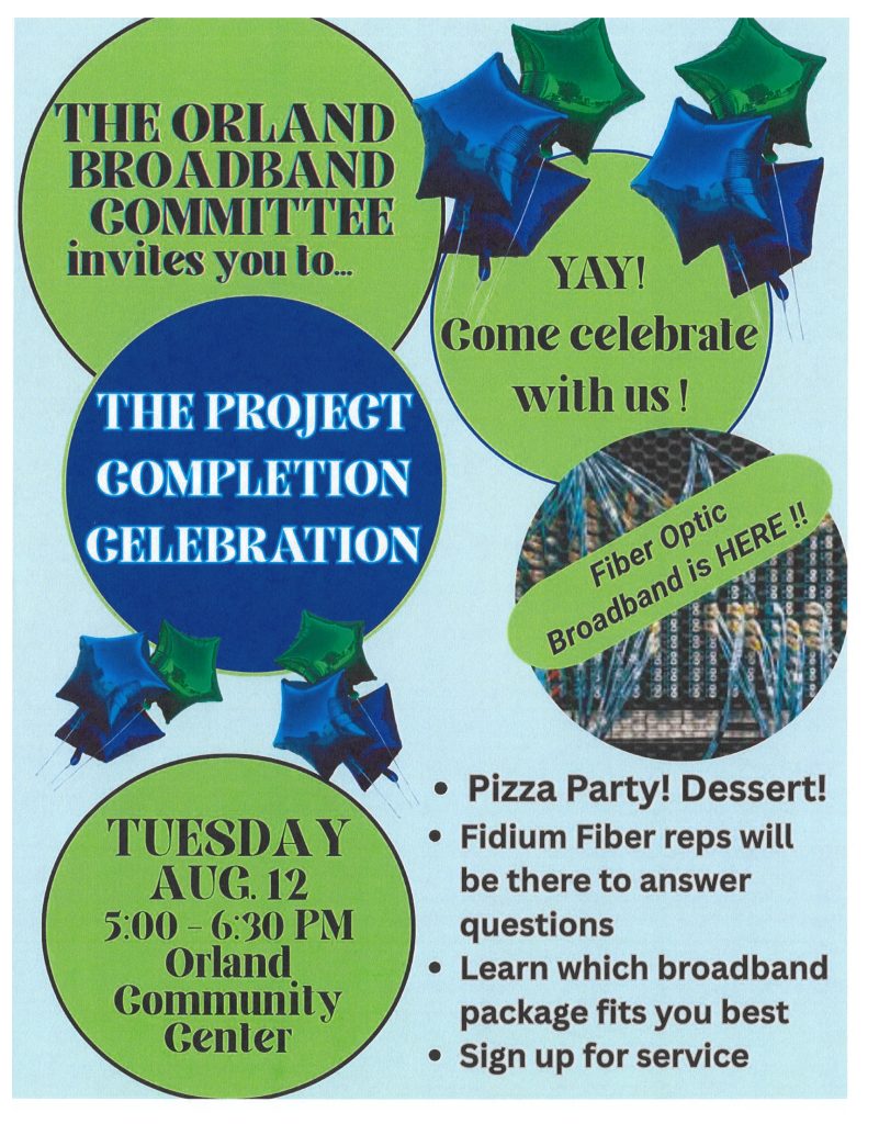 Hey Orland! Fiber optic broadband is HERE! The Orland Broadband Committee invites all to come CELEBRATE with us! TUESDAY, AUGUST 12TH from 5:00 – 6:30 pm. Drop in for PIZZA, BEVERAGES, AND DESSERT. Fidium Fiber representatives will be there to answer questions. Learn about the different service packages available. Sign up for service. This will be hosted at the Orland Community Center located at 21 School House Road Orland Maine 04472.