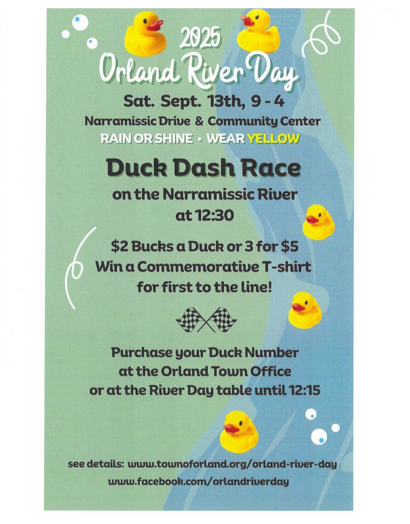 Orland River Day is doing a Duck Dash! The event will be held on September 13th on teh Narramissic River at 12:30. Ducks are $2 bucks each or 3 ducks for $5. The first duck to cross the finish line wins a commerative t-shirt and mystery prize package! The ducks can be purchased at the Orland Town Office during business hours or at the Orland River Day Booth on September 13th! Any questions please contact the River Day committee at [email protected]