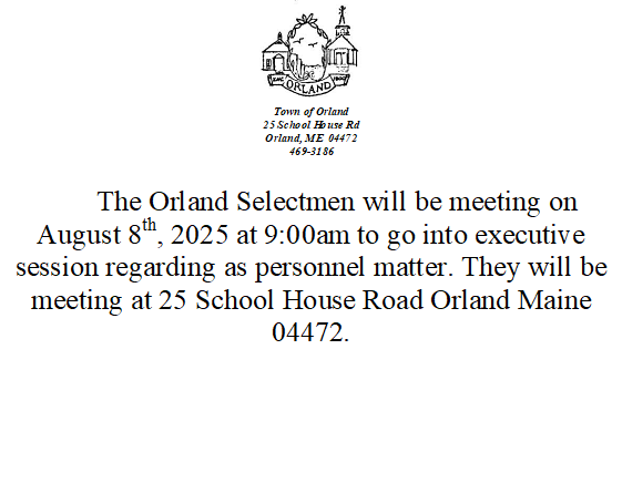 The Orland Selectmen will be meeting on August 8th, 2025 at 9:00am to go into executive session regarding as personnel matter. They will be meeting at 25 School House Road Orland Maine 04472.