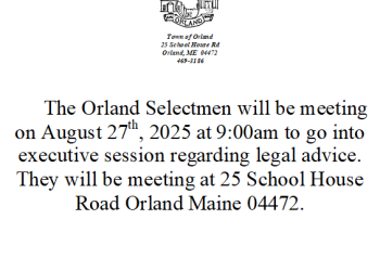 The Orland Selectmen will be meeting on August 27th, 2025 at 9:00am to go into executive session regarding legal advice.… Read More