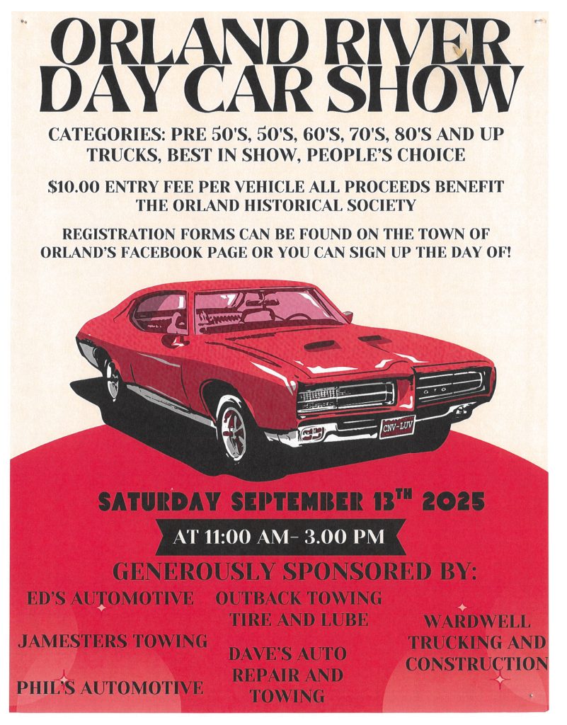 Have an antique car and want to show it off? Join us at Orland River Day from 11-3p.m. and enter the car show at the Orland Community and Fitness Center! The $10 entry fee and all proceeds from the show will benefit the Orland Historical Society. Questions? Please contact the Orland River Day committee at [email protected].