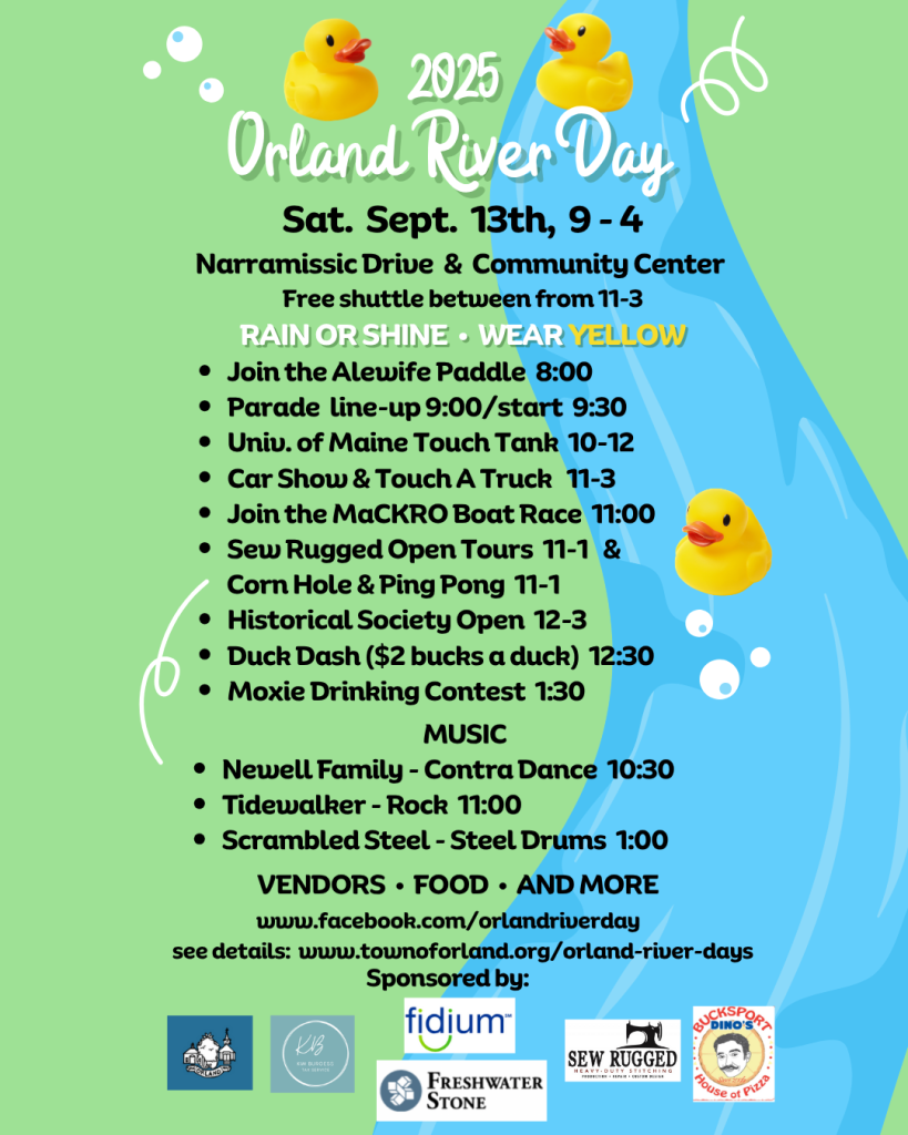 Orland River Day is right around the corner!! Happening September 13th, 2025 from 9-4 along Narramissic Drive and from 11-3 at the Orland Community and Fitness Center. There are still a few vendor spaces available and the parade could always use more floats and participants! If you would like to be a vendor or be in the parade please contact the Orland River Day Committee at [email protected] or call the Town Office at 207-469-3186! We look forward to seeing everyone there!