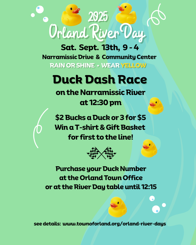 Don’t forget that a Duck Dash Race will be held along Narramissic River this year at 12:30 for Orland River Day! There are still ducks for sale which can be purchased at the Orland Town Office during business hours. Remaining ducks will be sold at Orland River Day until 12:00 at the River Day booth.