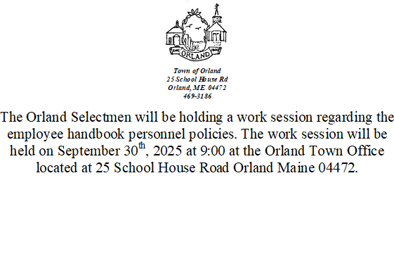 The Orland Selectmen will be holding a work session regarding the employee handbook personnel policies. The work session will be held on September 30th, 2025 at 9:00 at the Orland Town Office located at 25 School House Road Orland Maine 04472.