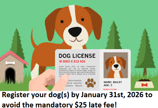 2026 Dog Licenses will be available October 15, 2025! All dogs over 6 months must be registered with the Town each year. Dog Licenses are $6 for spayed/neutered dogs, $11 for unaltered dogs. We will just need to see proof of up-to-date rabies vaccination. Per State law dog’s not registered  by January 31st, 2026 will incur a mandatory $25 late fee.