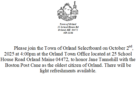 Please join the Town of Orland Selectboard on October 2nd, 2025 at 4:00pm at the Orland Town Office located at 25 School House Road Orland Maine 04472, to honor Jane Tannehill with the Boston Post Cane as the oldest citizen of Orland. There will be light refreshments available.