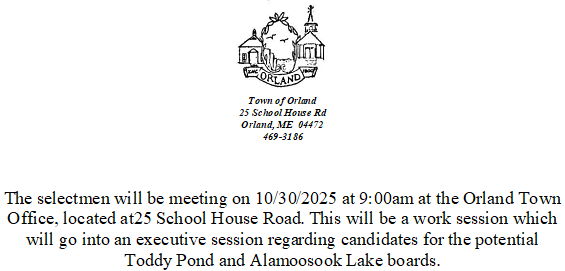 The selectmen will be meeting on 10/30/2025 at 9:00am at the Orland Town Office, located at25 School House Road. This will be a work session which will go into an executive session regarding candidates for the potential Toddy Pond and Alamoosook Lake boards.