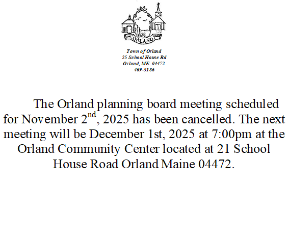 The Orland planning board meeting scheduled for November 2nd, 2025 has been cancelled. The next meeting will be December 1st, 2025 at 7:00pm at the Orland Community Center located at 21 School House Road Orland Maine 04472.