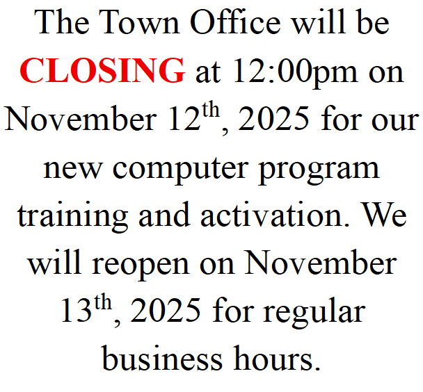 The Town Office will be CLOSING at 12:00pm on November 12th, 2025 for our new computer program training and activation. We will reopen on November 13th, 2025 for regular business hours.