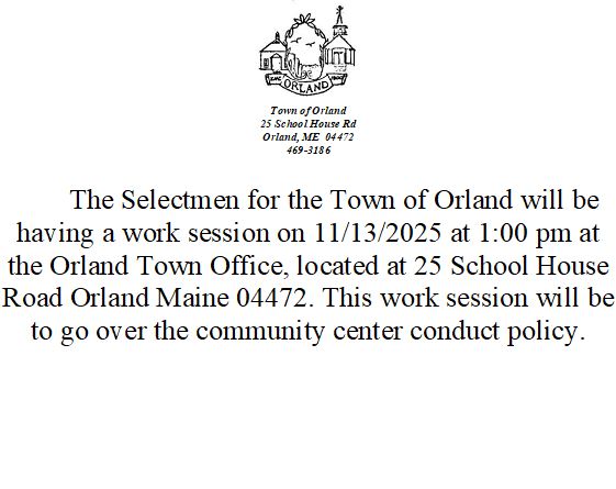 The Selectmen for the Town of Orland will be having a work session on 11/13/2025 at 1:00 pm at the Orland Town Office, located at 25 School House Road Orland Maine 04472. This work session will be to go over the community center conduct policy.
