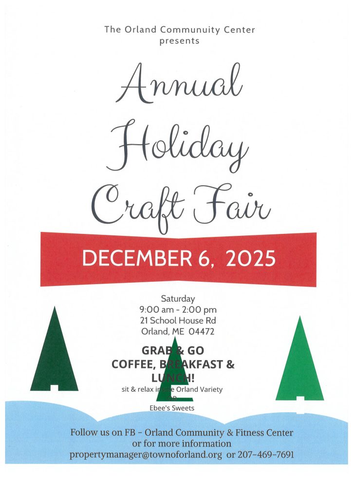 Get ready for the Christmas Holiday by visiting the Orland Community Center Saturday December 6th from 9-2 for the Annual Holiday Craft Fair. This year the gym will be packed with over 40 vendors. There will also be food available from Orland Variety and Ebee’s Sweets.