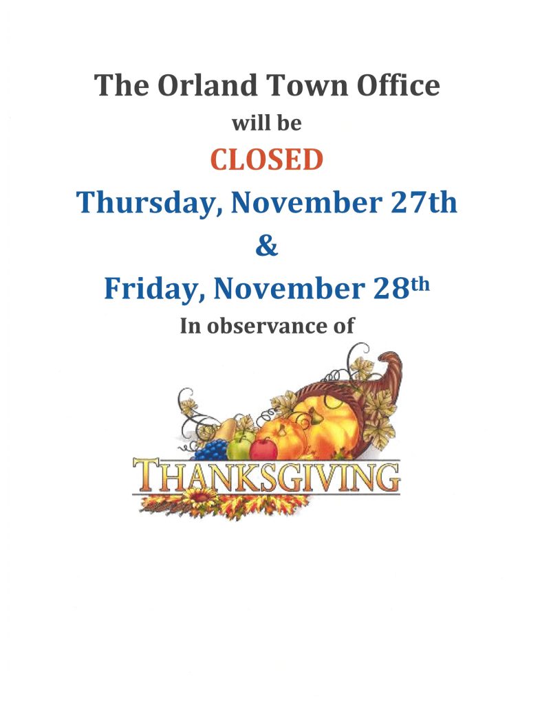 The Orland Town Office will be CLOSED Thursday, November 27th   & Friday, November 28th In observance of Thanksgiving. We will reopen for normal hours Tuesday December 2nd.