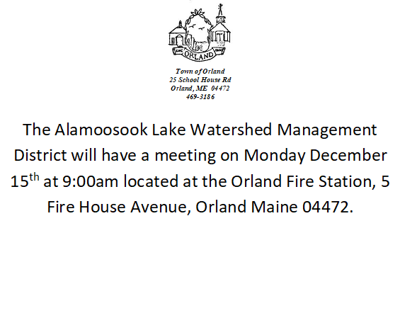 The Alamoosook Lake Watershed Management District will have a meeting on Monday December 15th at 9:00am located at the Orland Fire Station, 5 Fire House Avenue, Orland Maine 04472.