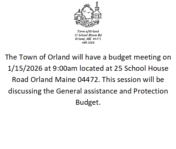 The Town of Orland will have a budget meeting on 1/15/2026 at 9:00am located at 25 School House Road Orland Maine 04472. This session will be discussing the General assistance and Protection Budget.