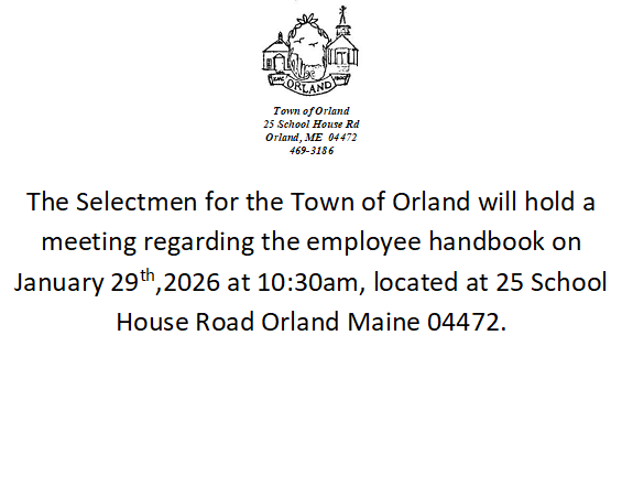 Employee Handbook Meeting: The Selectmen for the Town of Orland will hold a meeting regarding the employee handbook on January 29th,2026 at 10:30am, located at 25 School House Road Orland Maine 04472.